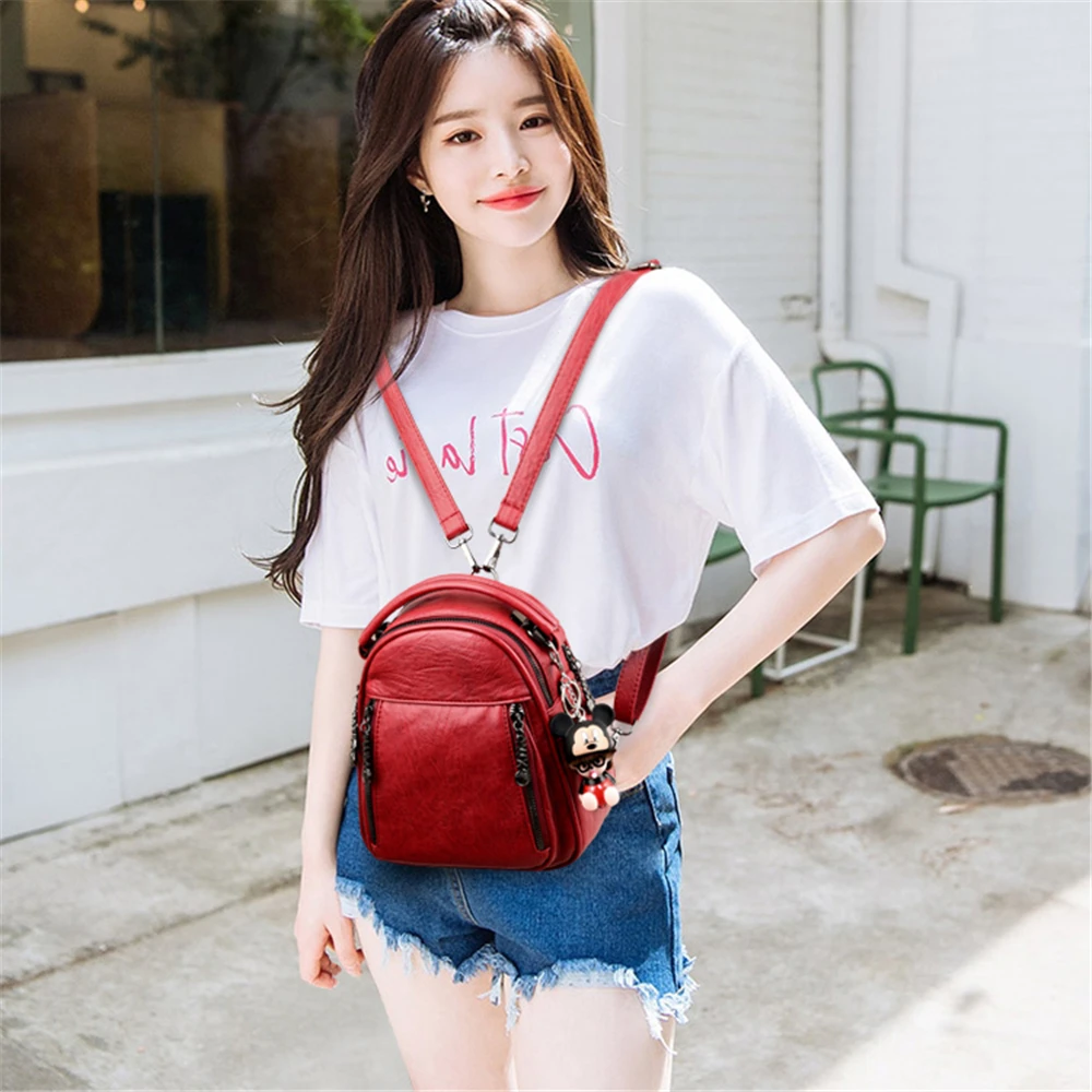 3 in 1 Casual Womens Soft Leather Mini Backpack Cartoon Pendant School Bags For Teenage Girls Solid