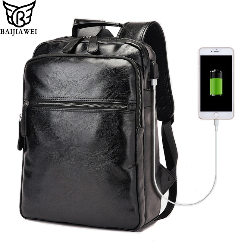 BAIJIAWEI Large Capacity PU Leather Backpack USB Charging Men's Business Laptop Backpack School Bag