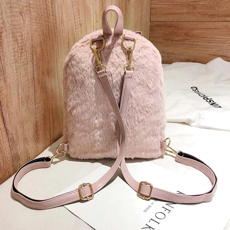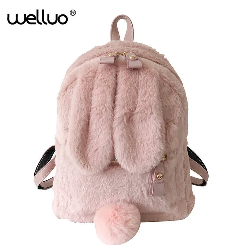 Cute Faux Fur Mini Backpack Rabbit Ear Women Travel Shoulder Bags Fashion Plush Bagpack Rucksack Sc